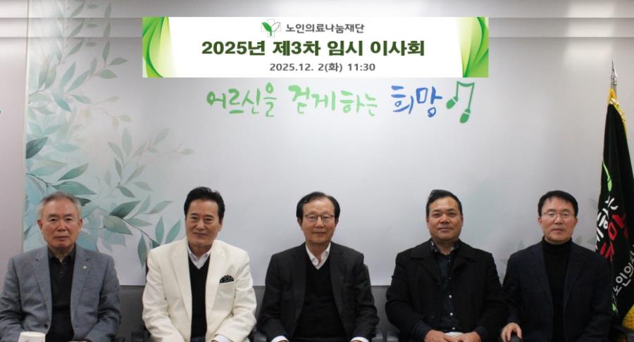 행사갤러리 노인의료나눔재단 2025년 제3차 임시 이사회 개최 등록일2025-12-03 노인의료나눔재단은 2025년 12월 2일(화) 오전 11시30분, 재단 사무실에서 유만진 사무처장의 진행으로 2025년 제3차 임시 이사회를 개최했습니다. 이날 회의는 개회선언 및 국민의례 후, 다음과 같은 안건을 심의·의결하였습니다.제1호 의안 : 재단 운영현황 보고제2호 의안 : 재단 정관변경 취지 및 진행사항 경과보고제3호 의안 : 재단 정관변경 보건복지부 불허 검토의견보고 이전글 목록 다음글