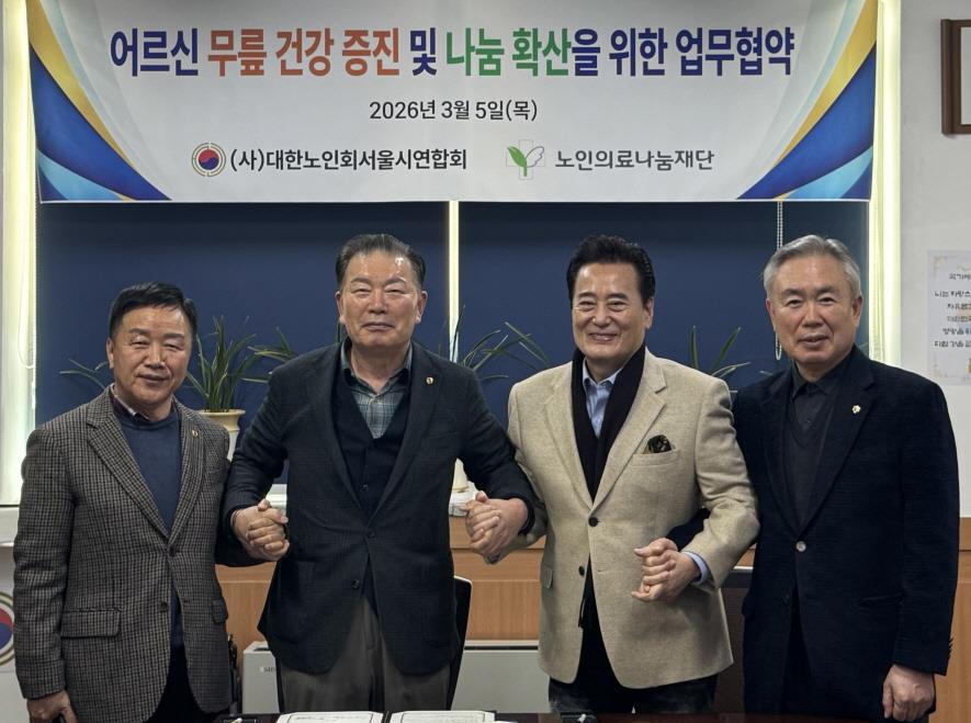 (재)노인의료나눔재단(이사장 김성환)와 (사)대한노인회 서울시연합회(회장 고광선)이 어르신들의 건강한 노후를 위해 뜻을 모았다. 양 기관은 3월 5일 오전 10시 30분, 서울 용산구에 위치한 서울시연합회 사무실에서 ‘어르신 무릎 건강 증진 및 나눔 확산을 위한 업무협약(MOU)’을 체결했다.