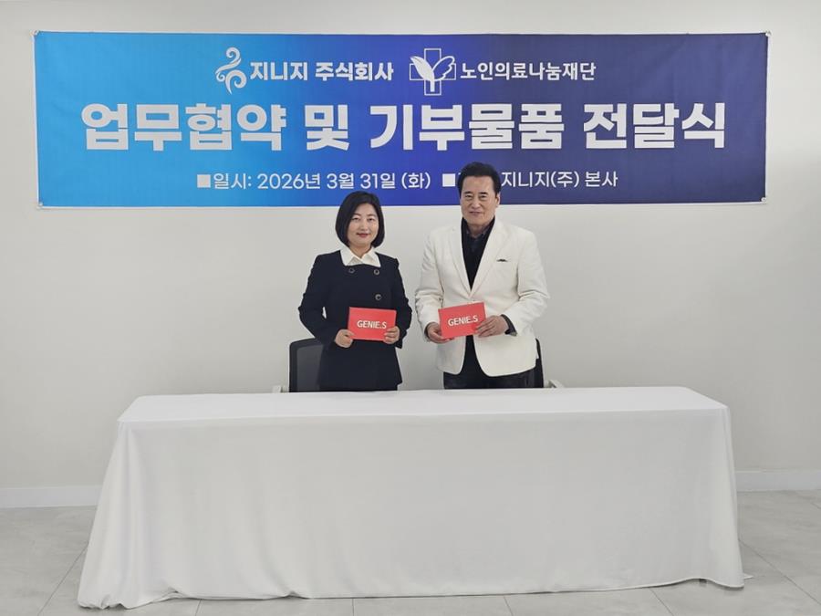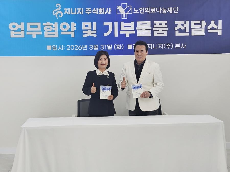 (재)노인의료나눔재단은 지난 2026년 3월 31일(화) 오전 11시, 지니지 주식회사 본사에서 지니지 주식회사(대표이사 이향심)와 상호 신의와 성실의 원칙을 바탕으로 사회공헌 활동 및 나눔 문화 확산을 위한 업무협약(MOU)을 체결했습니다.