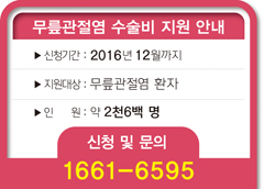 본인이 아니더라도 가족이나 이웃, 담당 사회복지사의 대리 신청도 가능하므로 비용 때문에 치료를 망설였던 무릎관절염 환자라면 수술비 부담 없이 관절염의 고통에서 벗어날 수 있다. 자세한 문의 및 신청은 노인의료나눔재단 대표전화(1661-6595)를 통해 가능하다.