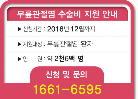 무릎관절염 수술비 지원은 굳이 본인이 신청하지 않더라도 가족이나 이웃, 담당 사회복지사의 대리 신청으로도 가능하다. 간병도 지원이 되기 때문에 무릎관절염 환자 및 환자를 둔 가족이라면 비용에 대한 부담을 덜 수 있다. 자세한 문의 및 신청은 노인의료나눔재단 대표전화(1661-6595)로 하면 된다.